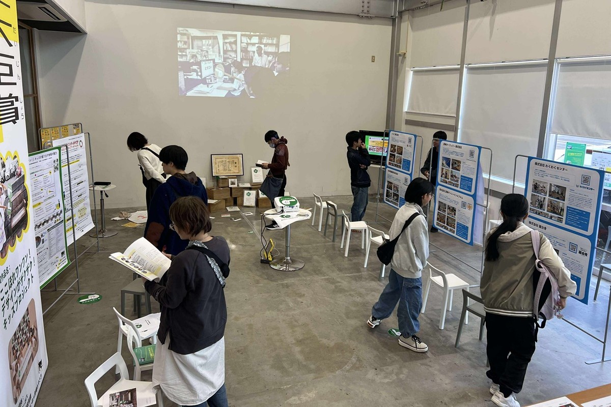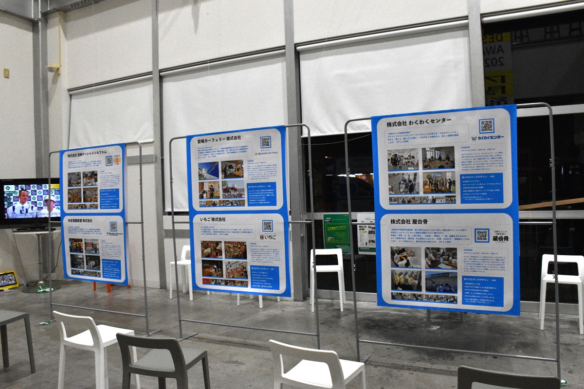 展示会では子どもたちが訪問した12の企業を紹介。「機械に乗せてくれた、人がやさしい」「スリッパがきれい」などといった各企業で見つけたキッズデザインや、訪問時の様子を写真で伝えました。会場は「んまつーポス」がレイアウトを担当。見学者にパネルを見ながらゆっくり語り合ってほしいと、隣り合うように椅子を配置している点など、「多くの人にキッズデザインを届ける」ための仕掛けが用意されていました。