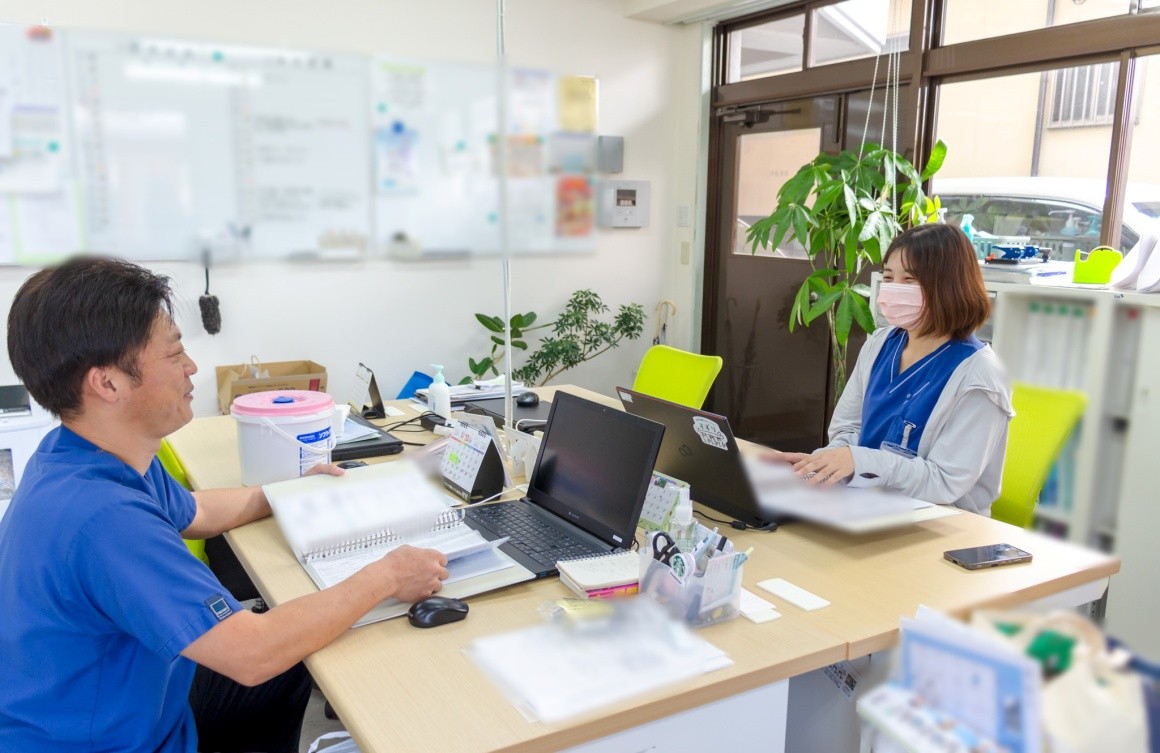 訪問看護は1人で訪問するため、自分で判断することが多いと思われがちですが、実際は医師の指示のもと動くため、看護師が判断することはありません。何かあれば救急車を呼んだり、代表や他の看護師に相談したりして進めます。困ったら「助けて」と言いやすい雰囲気を作っており、代表をはじめ親しみやすいスタッフ達です。
